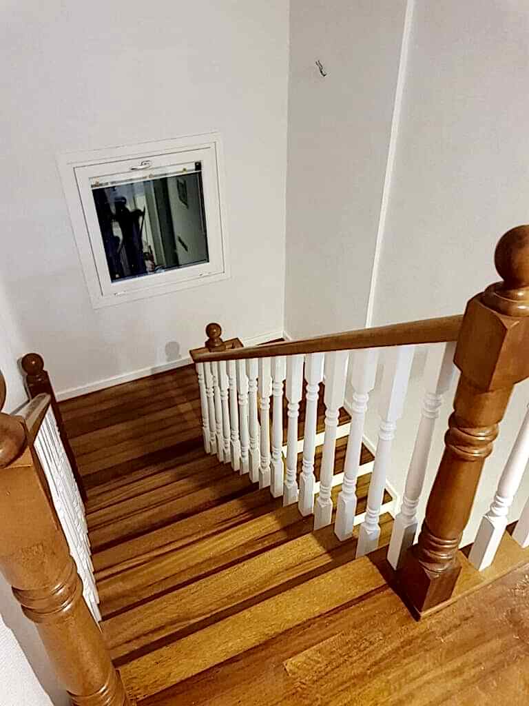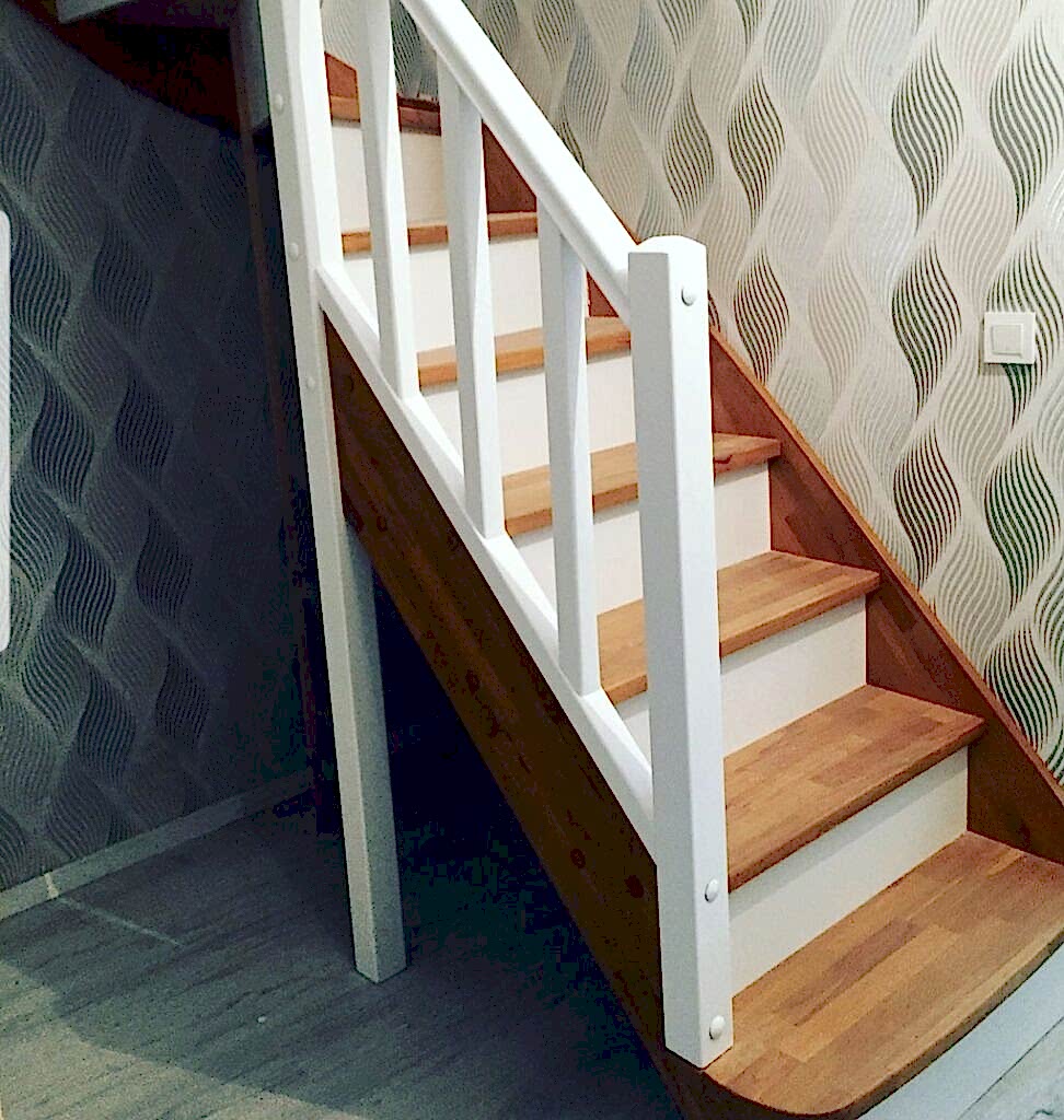 Geniş basamakları ve geniş tahtaları olan bu güzel ahşap merdiven, dışarının güzel manzarasını görmek için pencerenin yanındadır.Bu geleneksel merdiven, zarif görünümlü merdivenleri seven alçak evler için bir alternatif olabilir. Çoğunlukla meşeden yapılır, bu nedenle uzun ömürlüdür ve bakımı kolaydır.